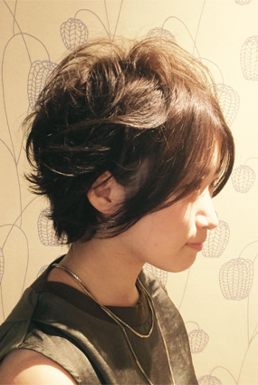 | 自然乾燥に、スクランチ!(手で軽く握る)のみです。スタイリング剤は、髪質、テイストに合わせて使用します。今回は、あえて、スモーキードライ&パウダースプレーです。ボリュームは耳にかけて、調整します! |